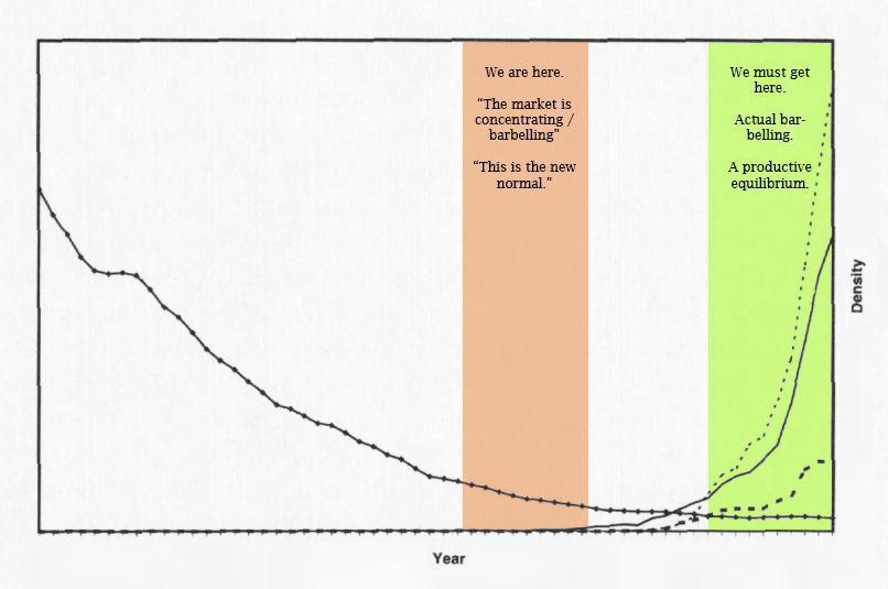 Venture capital has evolved from the business of funding cheap / high ROI experiments to the business of fuelling market expansion. As a result, it has inherited what was once a public market problem; the need to regularly demonstrate growth in order to boost share price.