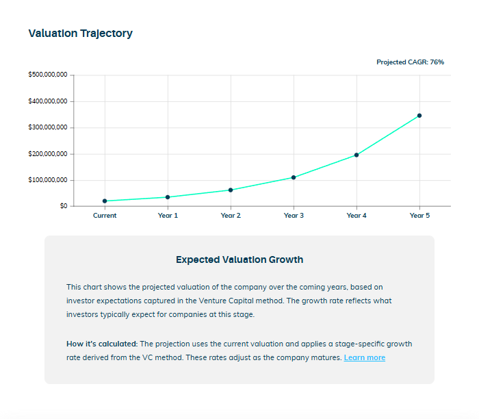 Consider the below: the valuation of a Seed round, calculated on Equidam at just over $20M. As a part of this calculation, and the future it’s predicated on, you can also see the valuation trajectory for the forecasted period. If the company raised a Series A at ~30 months, the valuation would be around $85M.