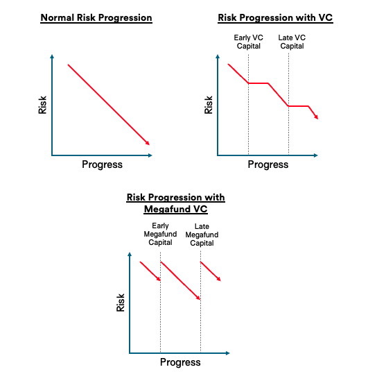 But in recent years, this picture has been skewed even more, especially if the capital raised comes from a mega VC fund. At each funding round, there is a significant re-risking of the startup, to the point that you are not moving meaningfully down the risk curve for a long long time. And even at a late stage, a mega funding round can bring you right back up to the point of maximum risk.